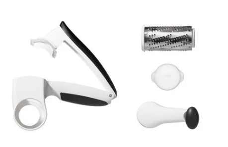The OXO Seal & Store Rotary Grater provides a compartment for storing un-grated cheese right inside, with an interior silicone seal that ensures it won’t dry out. Grate with the cap on and the window closed to collect cheese before serving, or slide the window open to grate the desired amount directly onto your dish. Bi-directional stainless steel blades can also shred chocolate and nuts, and the soft, comfortable, non-slip handle can be adjusted to accommodate both right- and left-handed users. Dishwasher safe. Features: Large barrel and sharp bi-directional stainless steel blades for efficient grating. Medium grating surface is ideal for hard cheeses, chocolate, nuts, and more. Cap collects grated cheese before serving. Adjust the window to pour the desired quantity. Adjustable handle accommodates right- and left-handed users. Silicone seal keeps cheese fresh when stored in the refrigerator.