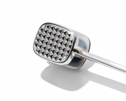 This die-cast aluminum meat tenderizer by OXO lets you pound meat flat for faster cooking. The pyramid-shaped teeth are perfect for breaking down tougher cuts, while the flat side makes short work of flattening poultry, pork, and beef to a uniform thickness for even cooking. The angle of the head is designed to maximize force, while heavy-duty construction provides just the right weight. The soft, non-slip handle fits comfortably in your hand and stays put, even when wet.