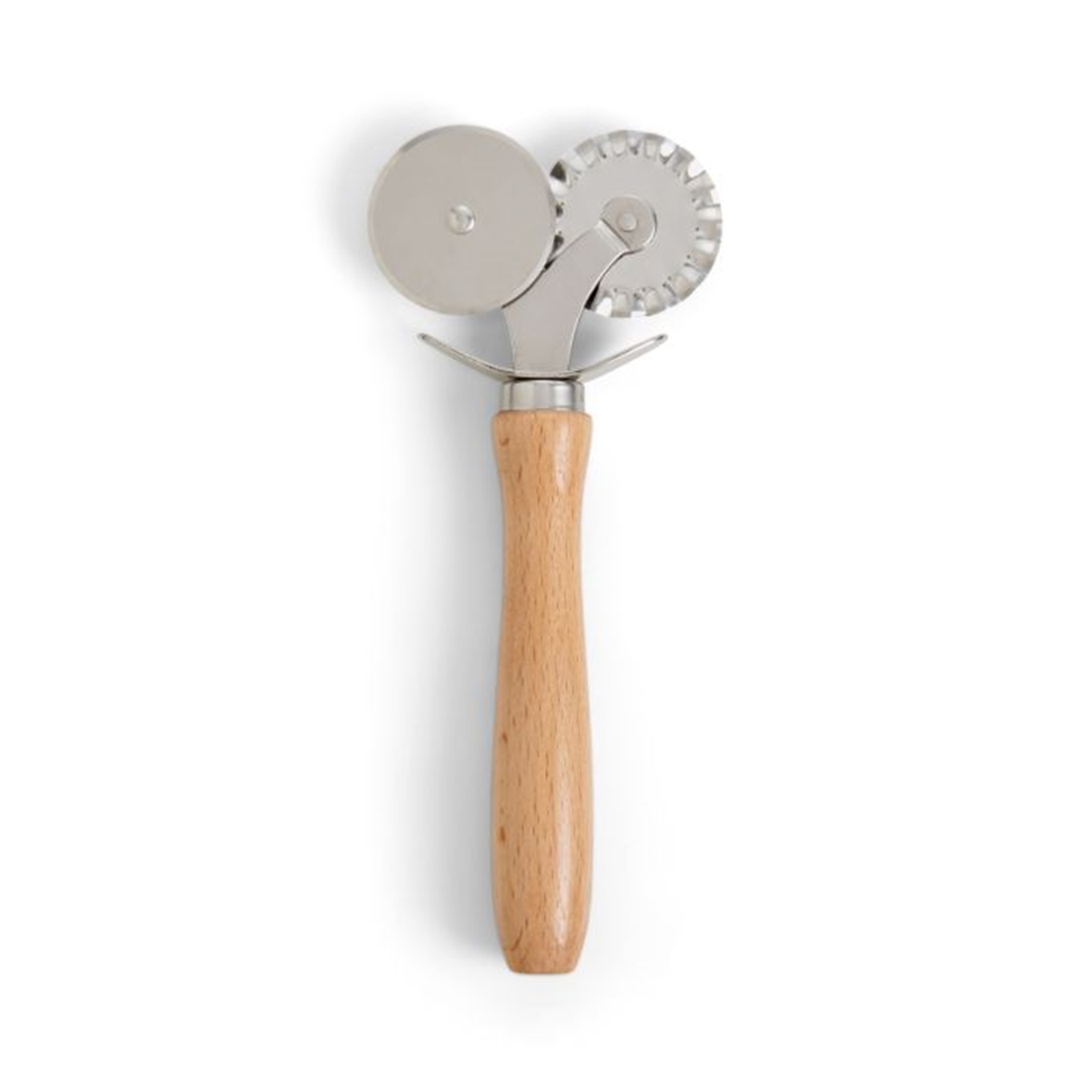 This Double Pasta Dough Cutter makes straight or zigzag cuts from pasta, pie, or cookie dough. Made in Italy and features 1.5-inch stainless steel blades and a beechwood handle. The double blades make straight or zigzag cuts. Hand wash in warm, soapy water. Occasionally, apply mineral oil to the handle.