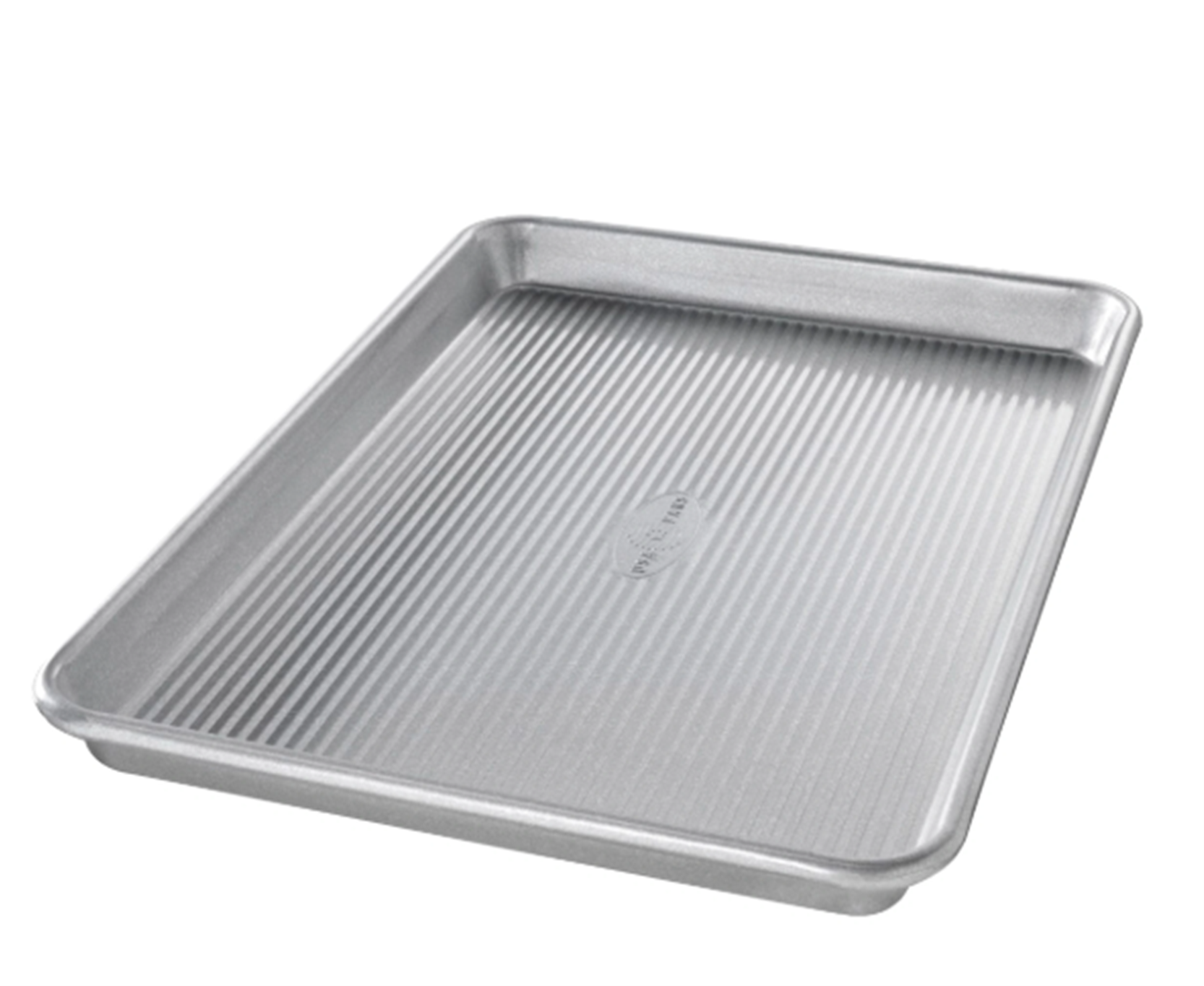 This Commercial-grade, heavy-gauge Quarter Sheet pan is made of aluminized steel and has corrugation for even cooking and extra strength. Features a non-stick silicone coating on top and bottom. Measures 12.5 inches by 9 inches by 1 inch. Oven safe to 450°F. Made in the USA.