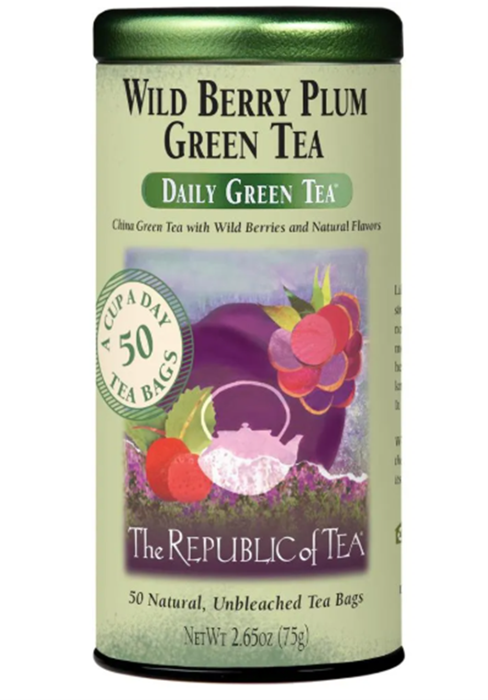 Daily Green Tea - A distinctly clean and bright flavored healthy China green tea. The heady aroma of sweet berries is balanced with the tartness of ripe plum, a flavorful way to refresh the day. 50 unbleached, all-natural tea bags packed in an airtight, recyclable tin. Made by Republic of Tea.