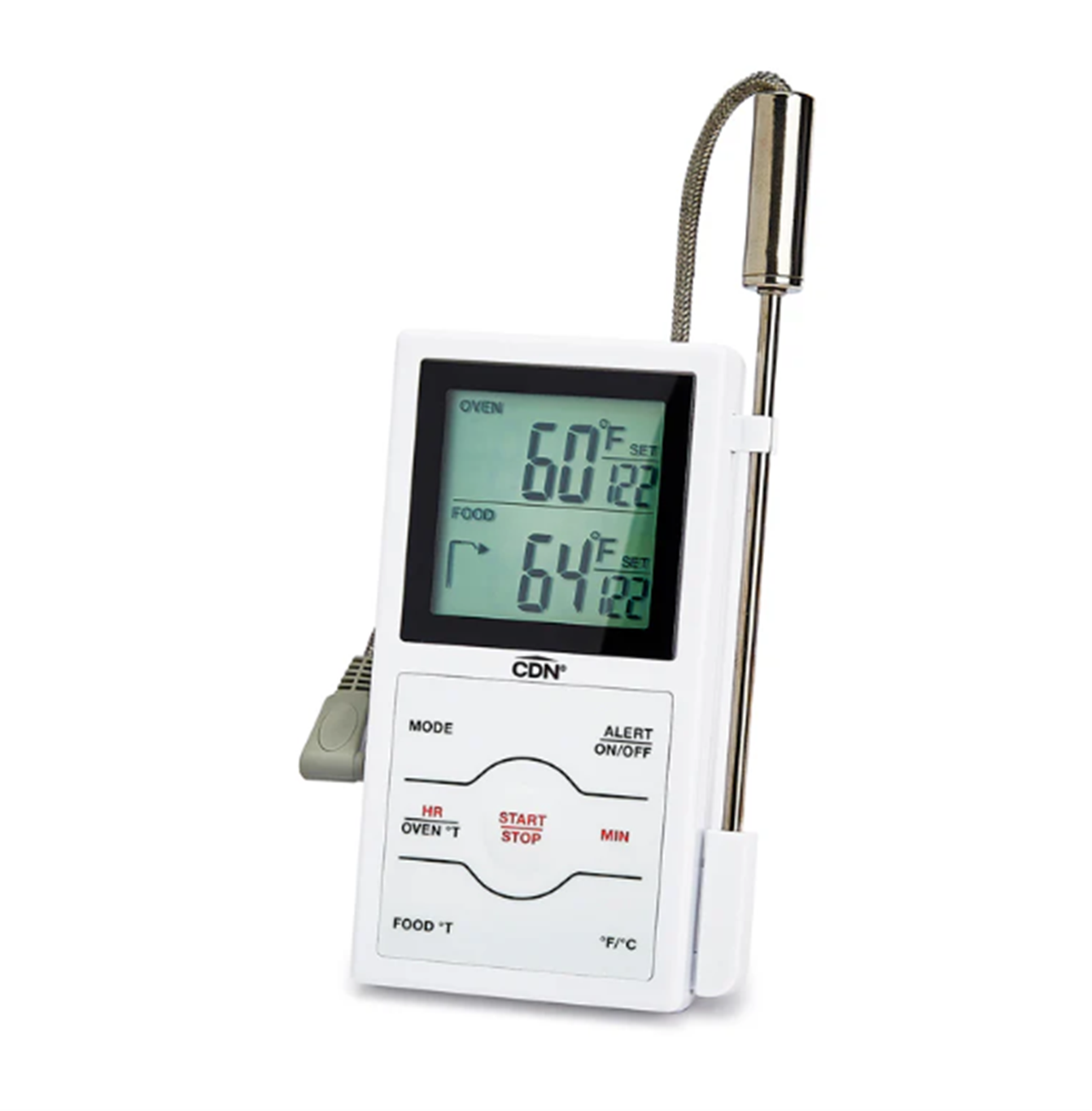 The greatest thermometer ever invented! This probe thermometer has two sensors (one for the meat and the other for the oven) and a digital read-out. Take the guesswork out of knowing when the meat is done by programming the desired temperature, and then the thermometer will beep when the meat is ready.